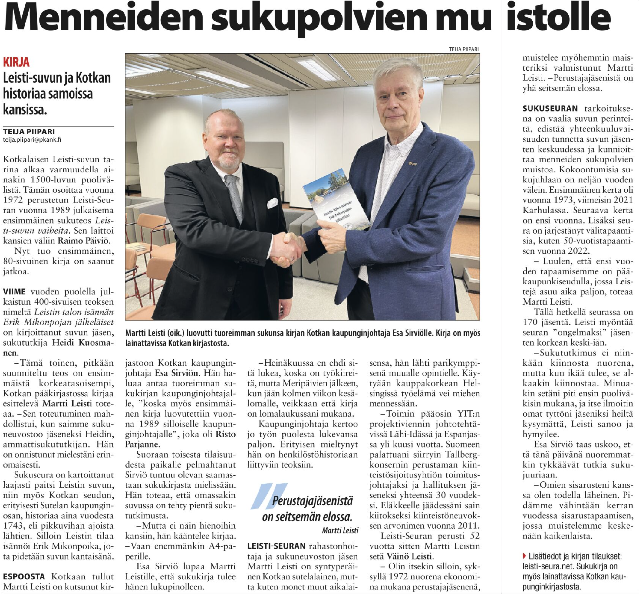 Martti Leisti kävi luovuttamassa Leistin uuden sukukirjan Kotkan kaupunginjohtaja Esa Sirviölle Kotkan pääkirjastossa. Yllä on kuva tapaamisesta kaupunginjohtajan kanssa. Lisäksi Leistin uusi sukukirja luovutettiin Kotkan kaupunginkirjastolle, josta se on lainattavissa.
